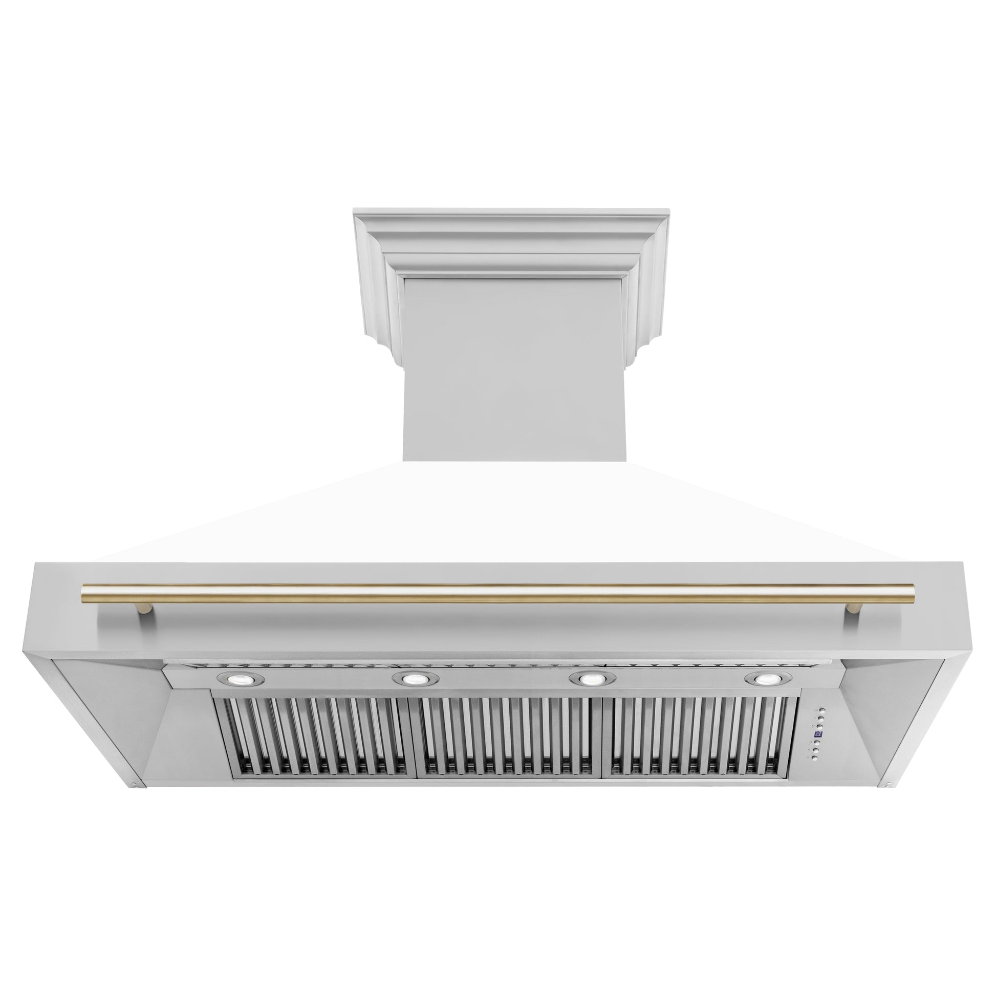 - Wall-mount hood with White Matte Shell and accented handle.